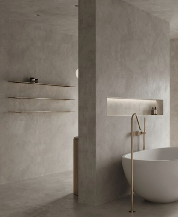 조적벽의 두께를 활용하면 안쪽에 홈(니치)을 파서 샴푸·바디워시 선반으로 쓸 수 있습니다.